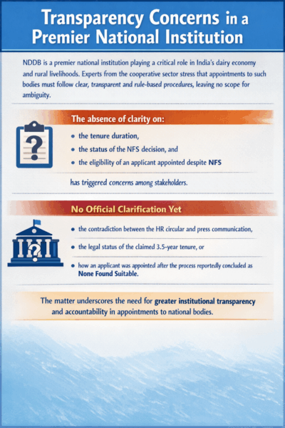 NDDB is a premier national institution playing a critical role in India’s dairy economy and rural livelihoods. Experts from the cooperative sector stress that appointments to such bodies must follow clear, transparent and rule-based procedures, leaving no scope for ambiguity.