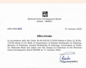 The circular issued by NDDB’s HR department states that Dr Meenesh Shah has taken charge as Chairman of NDDB with effect from 1 January 2026, in compliance with an order of the Department of Animal Husbandry & Dairying, Government of India. However, the circular does not mention any tenure period, nor does it refer to an extension of three-and-a-half years.